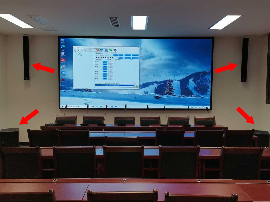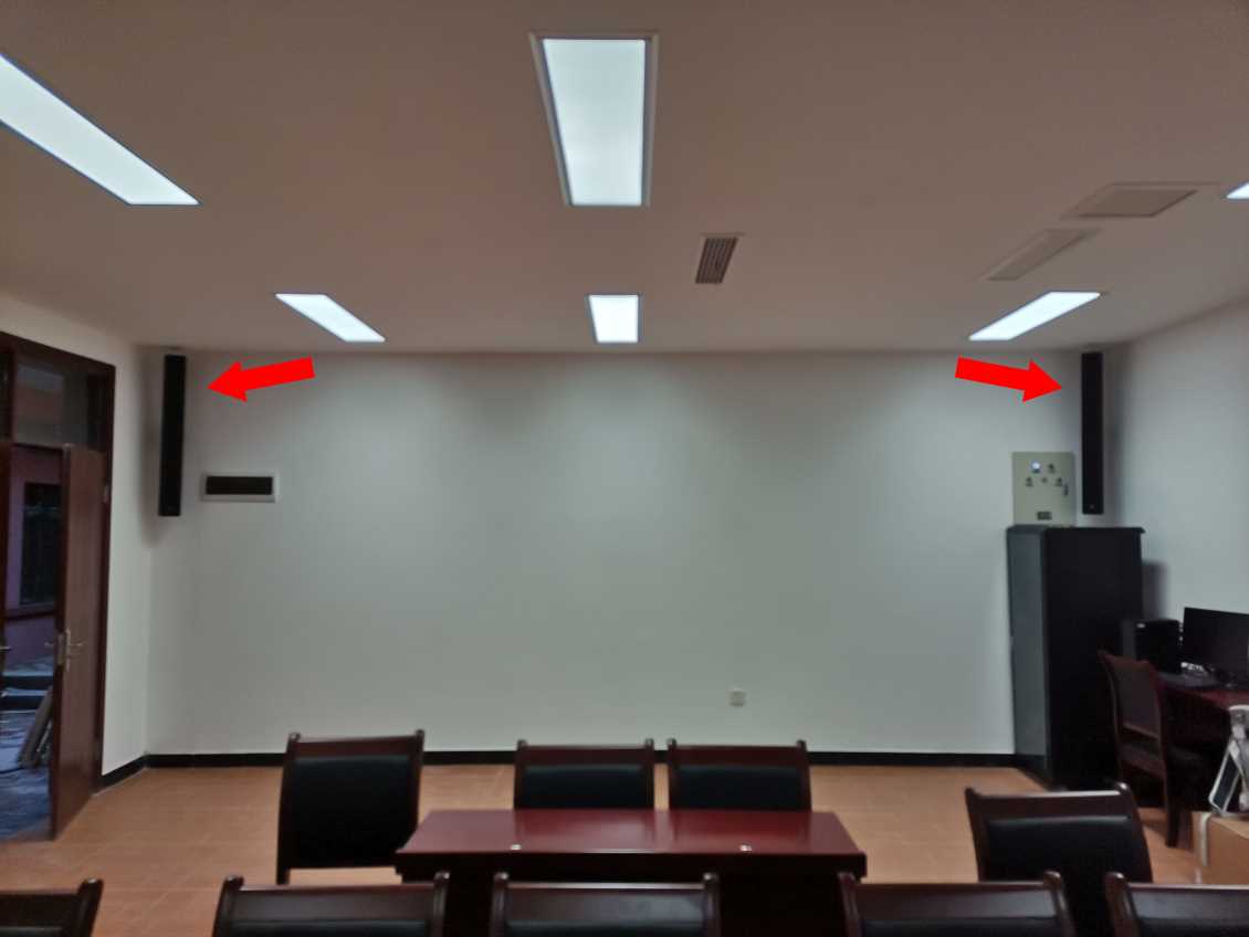 我们选用了四只TH-M481线性音柱和两只LA-12S低音浙江音箱来进行扩声。线性音柱具有小箱体,大功率的特点,人声清晰饱满,还原度高。会议室采用四角壁挂的安装方式,可以保证声压级均匀合理。