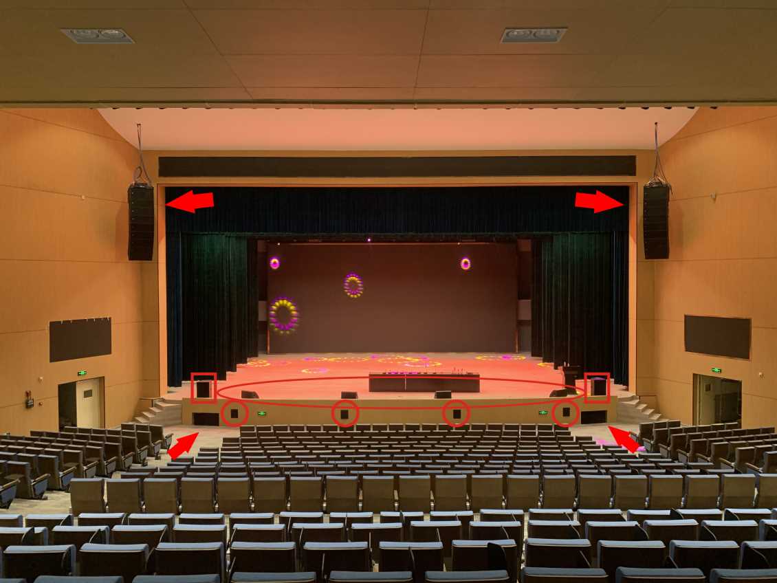 进入礼堂,映入眼帘的是两组线阵列音箱吊挂在舞台上方两侧,作为左右主扩音箱有传输距离远,衰减小的特点。能满足礼堂面积大和举行会议报告、文艺演出的使用需求。