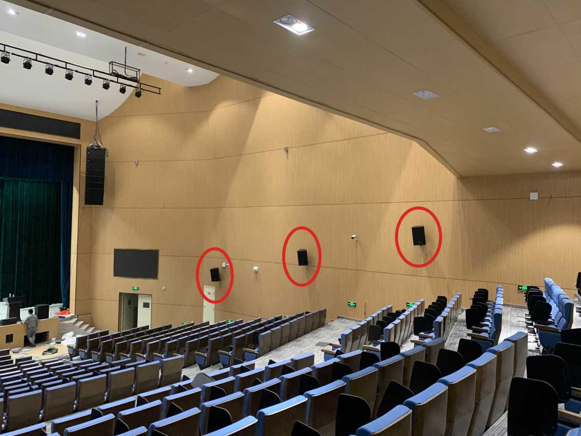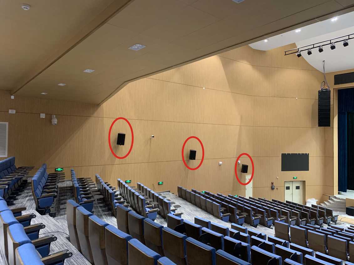 在礼堂两侧辅助补声音箱均匀壁挂在墙上,我们使用的K系列音箱能让声音自然清透。