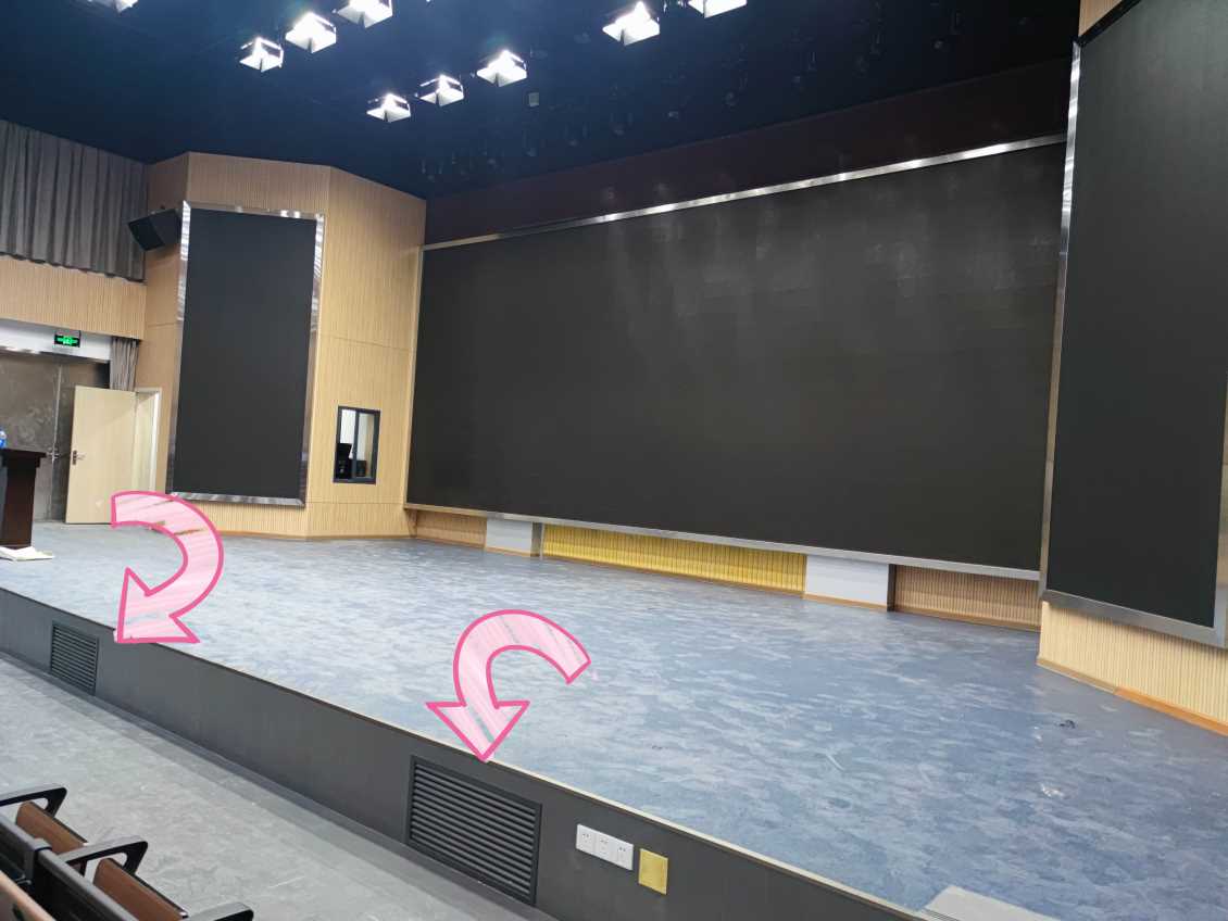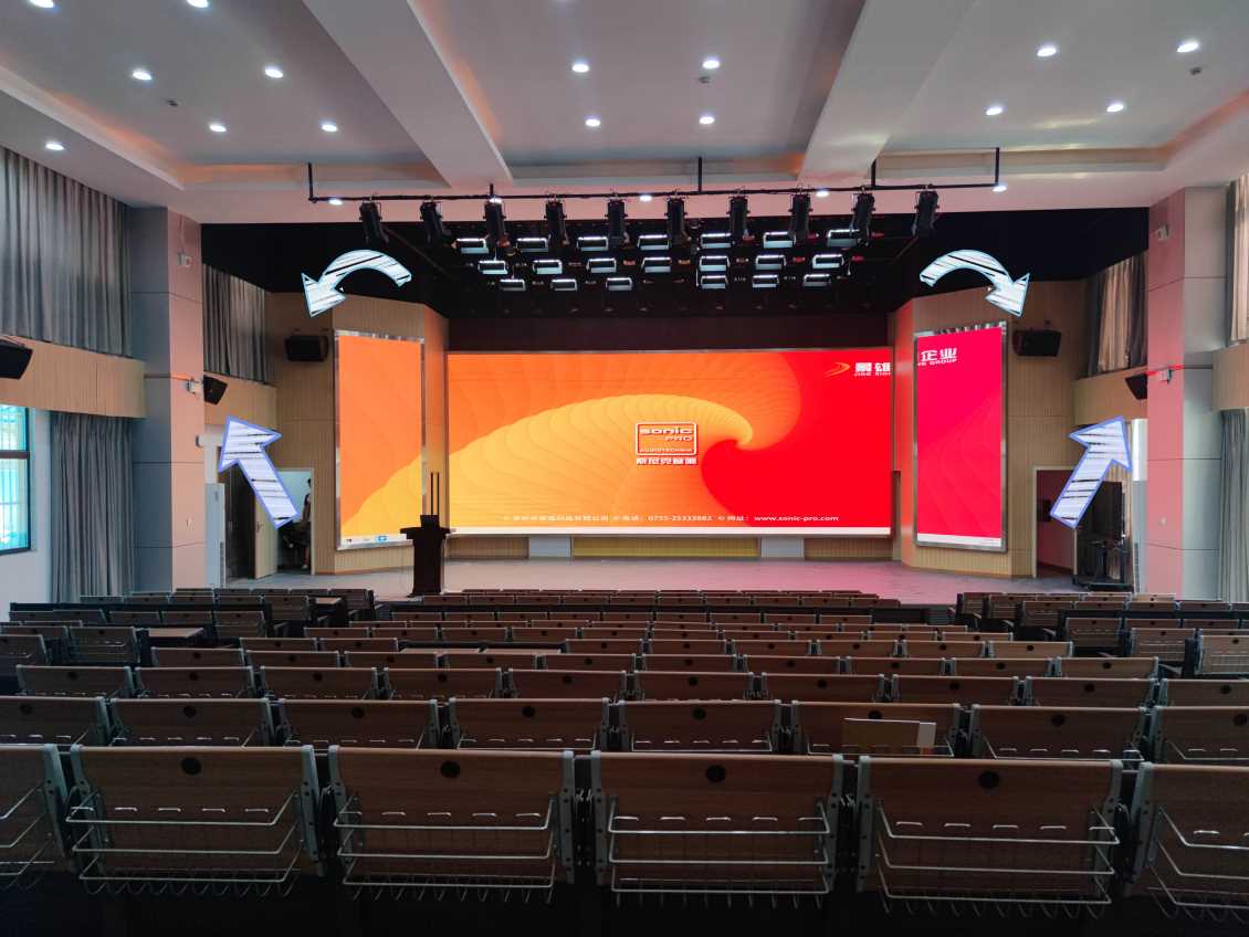正对着我们的是壁挂在侧屏两侧的SONIC PRO(斯尼克音响)K系列音箱,作为本次扩声系统的主扩音箱,能提供高音顺滑,中音通透,低音饱满的高品质扩声。