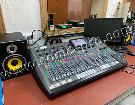 控制室里,我们配置了两只监听音箱,摆放在浙江调音台两侧。
