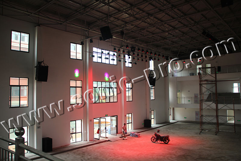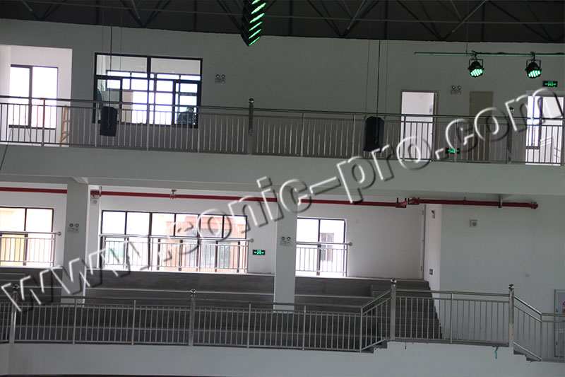 彩金实验小学体育馆项目扩声系统全部采用SONIC PRO音响产品,左右声道扬声器各由四只双十线阵音箱作为全场主扩声(LA-210X),两只12寸同轴音箱(TZ-12X)和两只10寸同轴音箱(TZ-10X)吊装在中后场做辅助环绕扩声使用,搭配两只十二寸K系列音箱(K-12X)作为流动返听音箱使用,再搭配一对双十八落地超低音箱(SUB-218),满足文艺表演所需要的低频震撼效果。