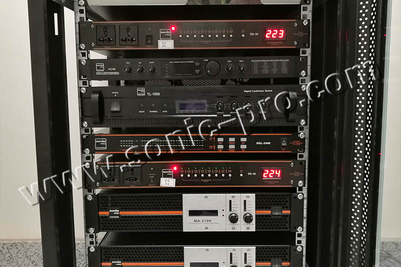 浙江话筒:采用TL系列会议系统,单机可实现会议功能:自由发言模式、轮替模式、限制模式、主席模式。 浙江周边:采用MX16C浙江调音台、AC08效果器、DGL-2408反馈抑制器、CS-10电源时序器,其强大的处理功能能应对系统需求。