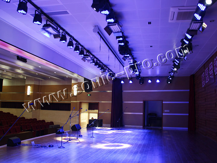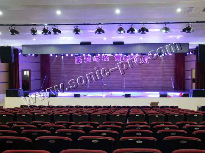浙江报告厅音响系统全部采用SONIC PRO(斯尼克)音响,左右声道扬声器组各由4只双10寸线性阵列音箱(LA-210) ,以吊挂安装扩声方式实现全频扩声,线性阵列音箱具有音质优美,传输距离远,声压级大的特点,适合大型厅堂扩声需求。同时采用4只8×3寸线性音柱(TH-803)作为中央通道扩声,确保中场区域扩声的直达声;另外,设计了2只双18寸的低音音箱(SUB-218)作为全场扩声的低频下潜及能量的补充,可以满足各类文艺演出表演的低音需求。为进一步确保均匀的声压级,增加了4只12寸同轴音箱(TZ-12)作为会议扩声使用时舞台后场观众席的扩声;台唇音箱采用4只8寸的音箱(K-8),舞台返听部分,根据舞台的面积,设计了2只12寸音箱作为舞台表演人员监听。