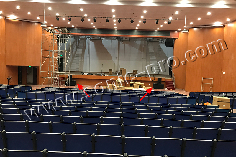 拉声像:由于主音箱吊挂在舞台上空,声像整体在舞台上空,为了解决这一问题,我们采用了SONIC PRO(斯尼克)音响的K-15音箱,摆放在低音音箱上。